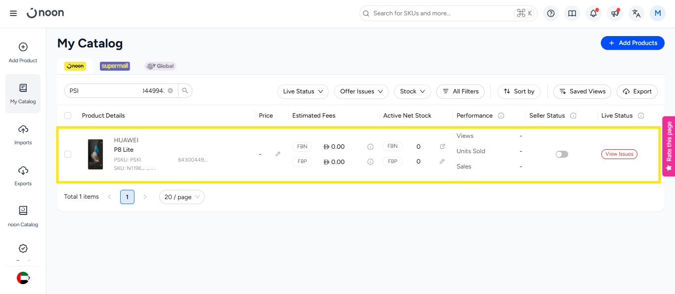 - Once the SKU is saved, it will be visible in your My Catalog section. You can search for it in the search bar.