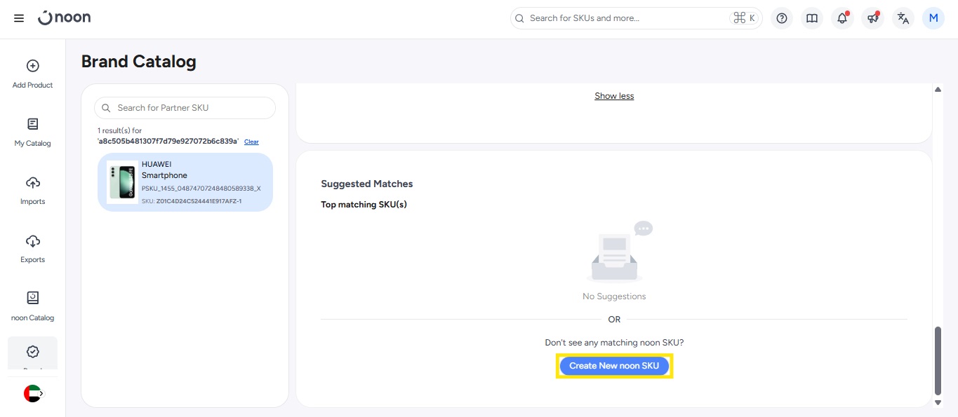 Select Product Creation Type: Begin with the single or bulk product creation workflow.Access Brand Catalog: Go to Seller Lab > Catalog > Brand Catalog and search for your product.Match or Create SKU: If a matching SKU exists, map to it. If not, Create a new noon SKU.