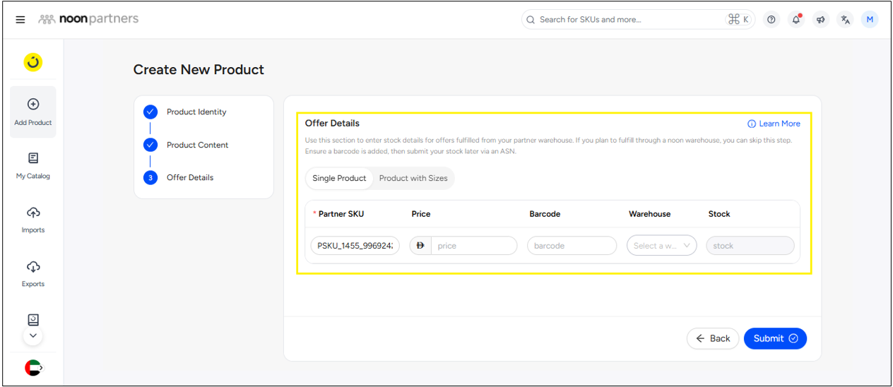 - Once you will fill all the details, just scroll down at the bottom and you will see an option to Create New noon SKU. Click on this button and your content will be submitted for review to the noon content team.