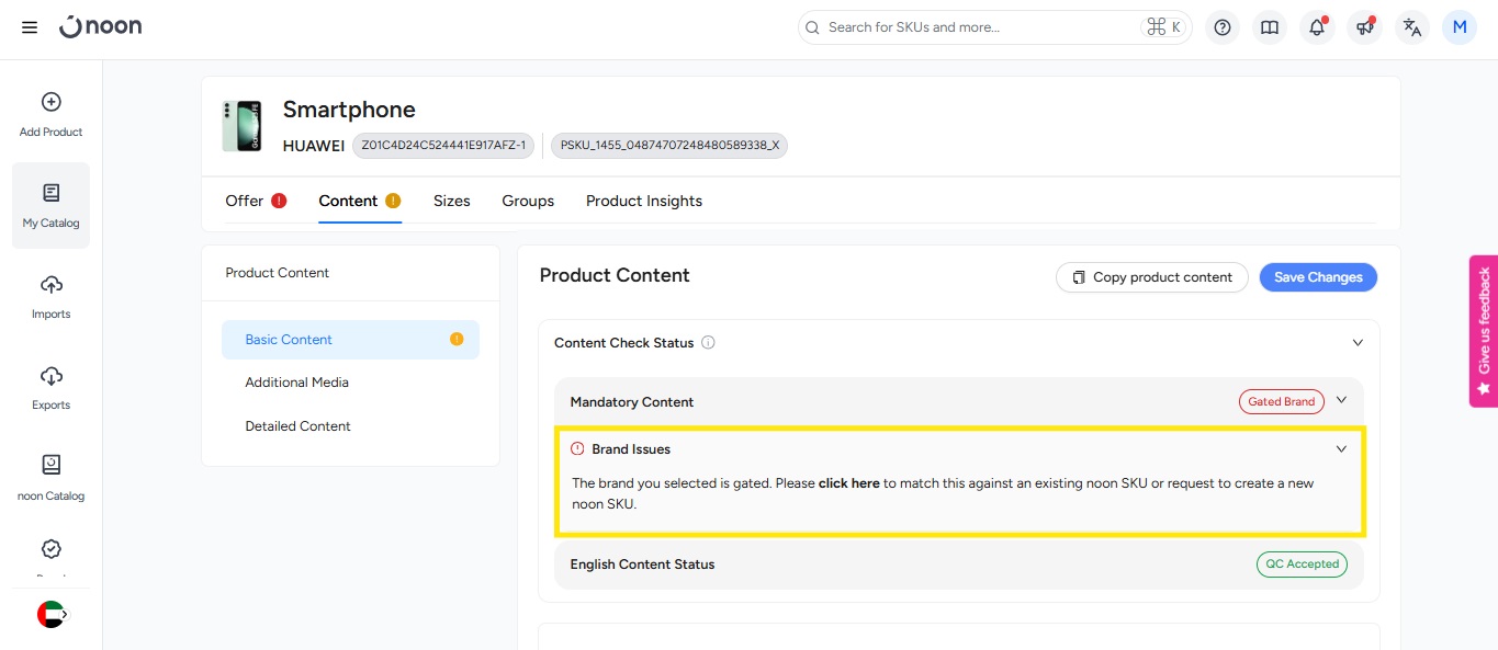 - Once you have filled in the details and click on Submit, you will be redirected to the content page for this SKU. Here you will notice a notification stating that this brand is gated and you can either map it against and existing noon SKU or request noon to create a new noon SKU using your content. Click on this option.