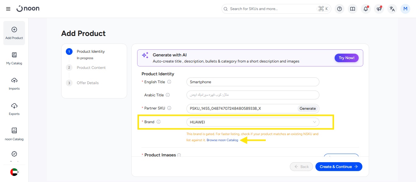 selected brand is Noon-controlled. (This brand is gated. For faster listing, check if your product matches an existing NSKU and list against it. Browse noon Catalog)