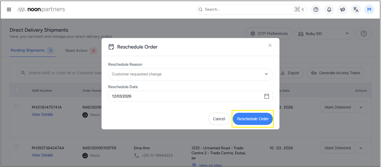 - In the pop-up window, choose the reason for rescheduling and select the new rescheduled delivery date.