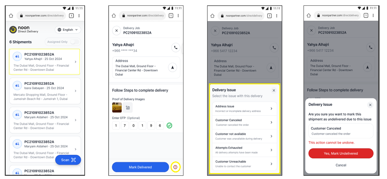 mark a shipment as undelivered, tap on the Report Issue Icon (!)