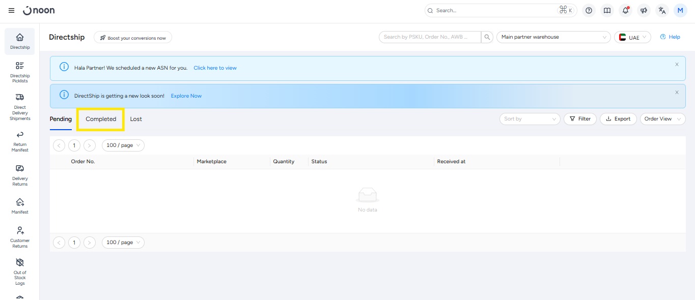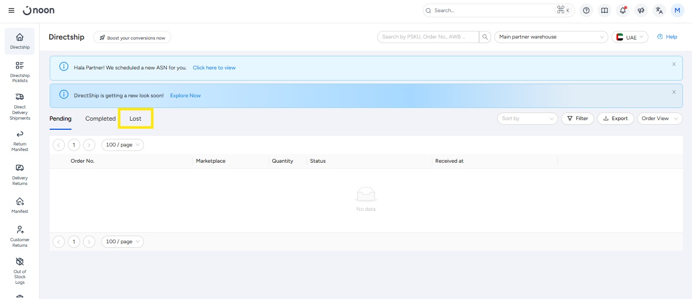 A. Shipped: This status is assigned to all shipments included in the manifest and delivered to Noon's Delivery Associate (DA). It also encompasses shipments transferred to logistics by the DA.