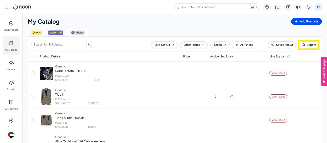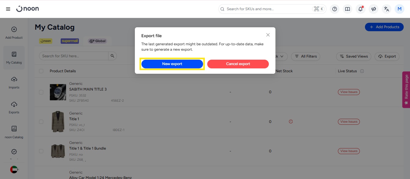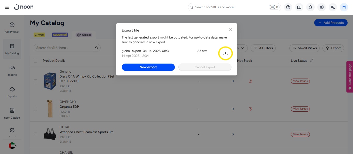 Download: Once the system processes the request, a file containing all your PSKUs (noon SKUs) will be available for download. Click on download to export the file.