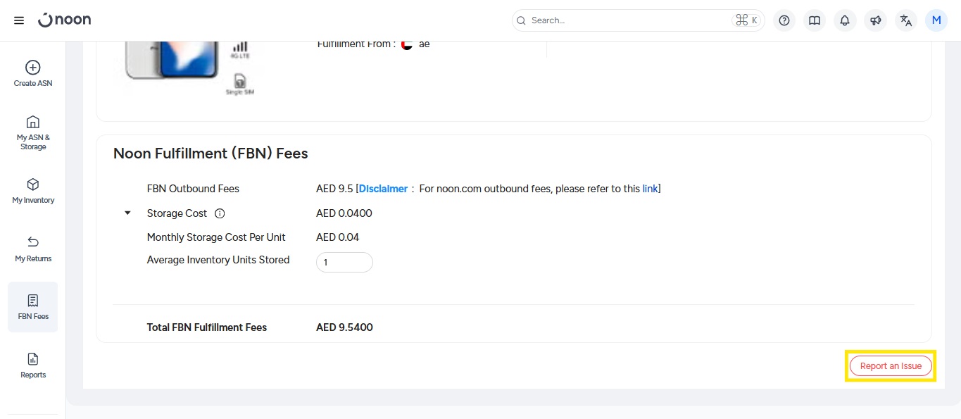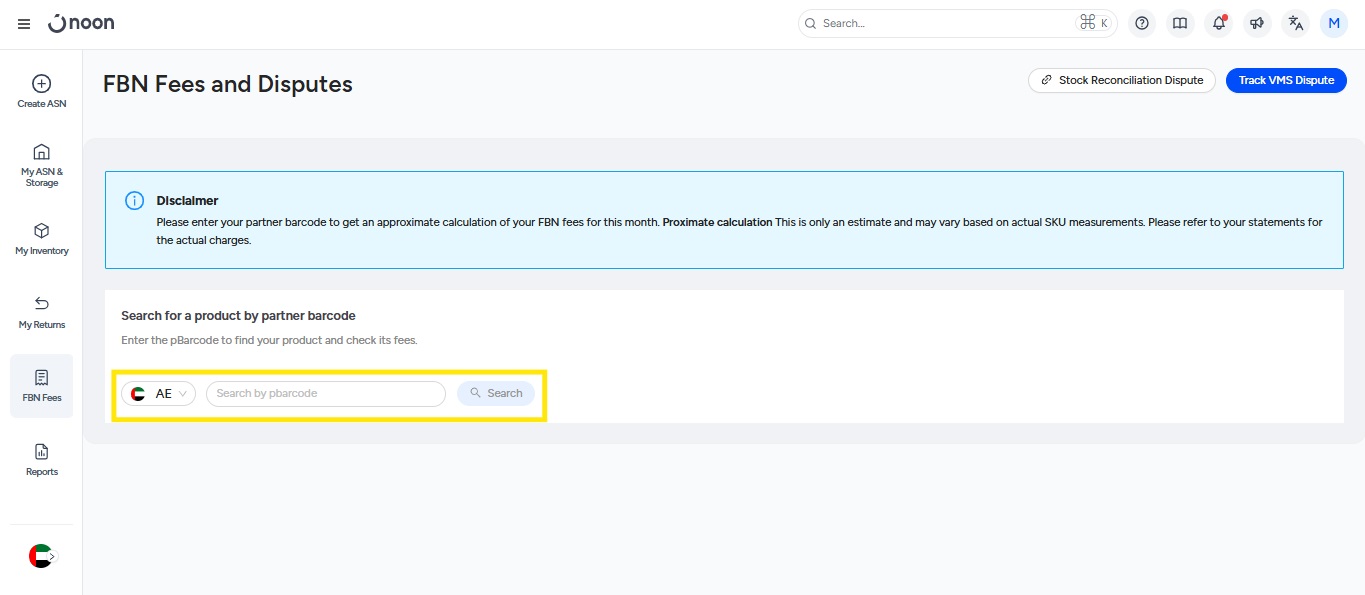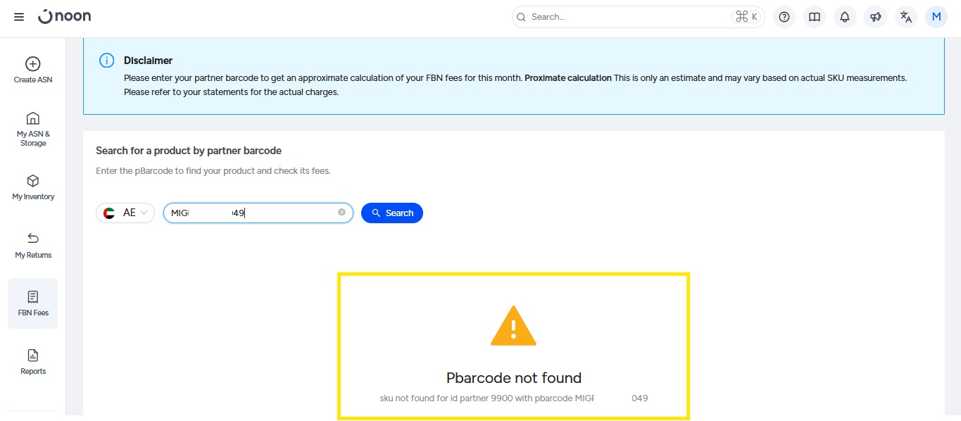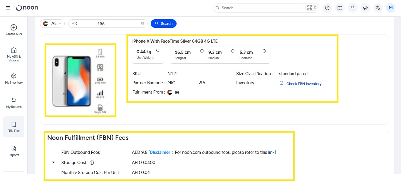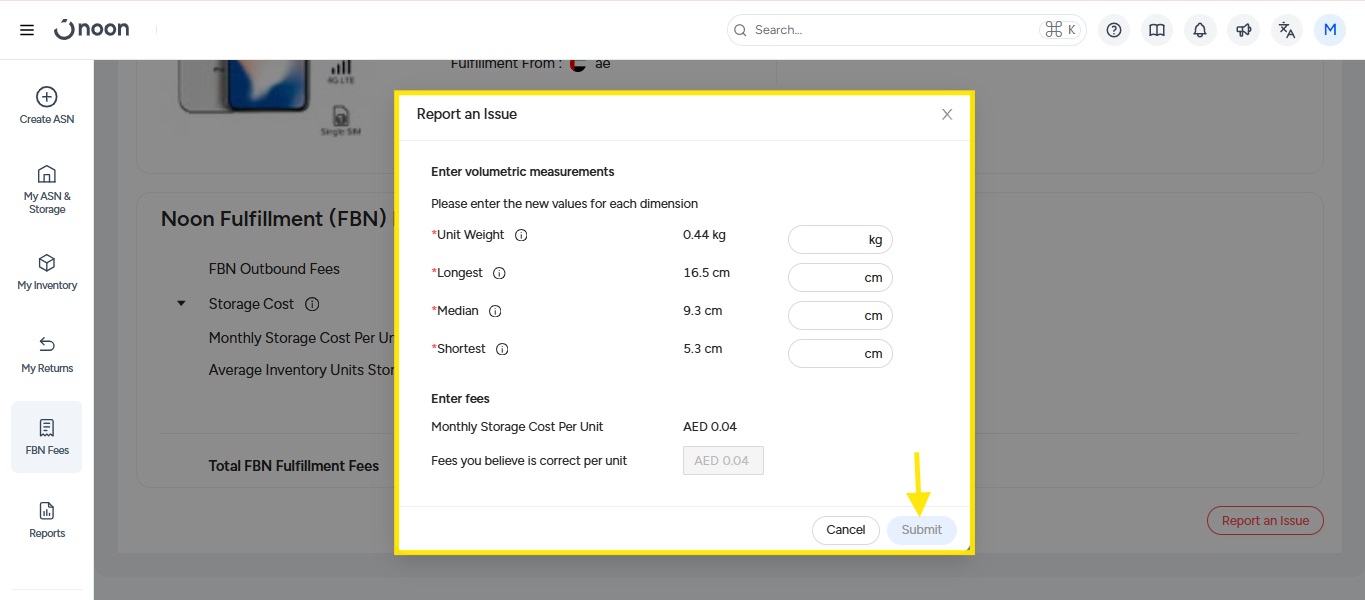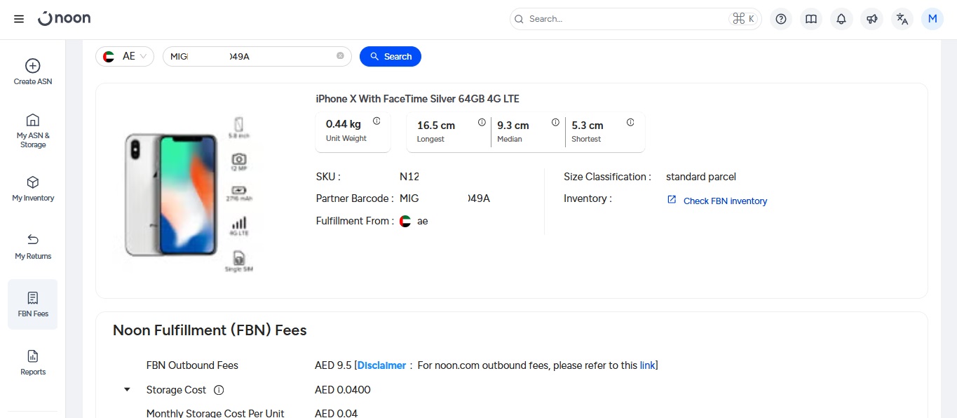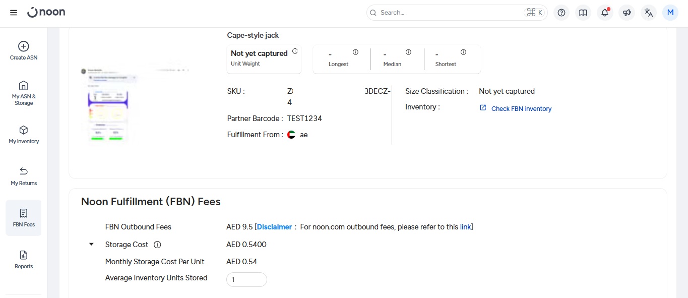 Noon’s FBN Fees dashboard provides sellers with clear visibility into product dimensions captured at Noon
