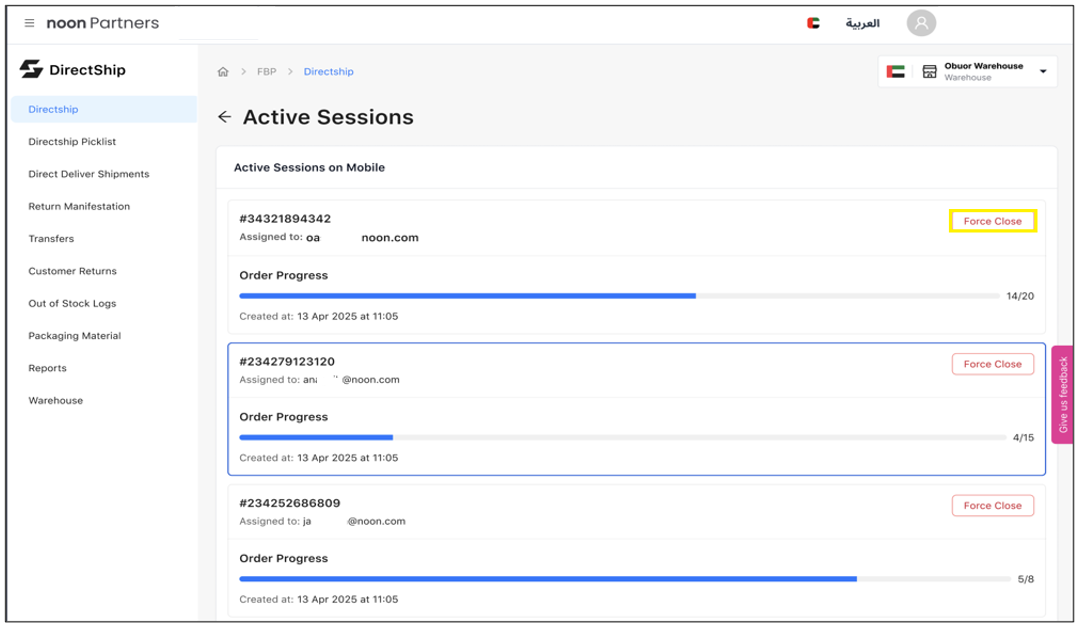 - This will show you all the active sessions that have orders assigned to them. You can click on Force Close if you want to close any session.