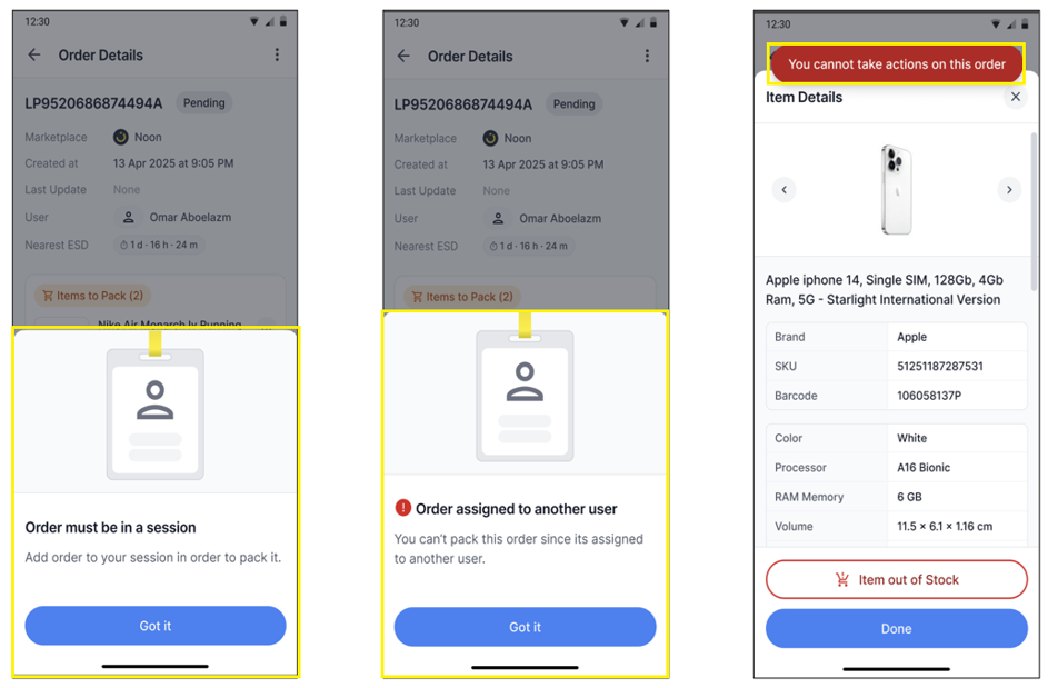 - If the order is not assigned to you, or if the order is assigned to someone else, you will see the following errors.