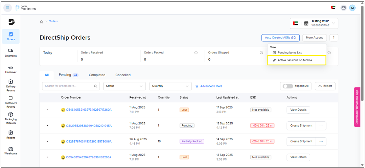- While the session is active, "Start Packing Session" becomes "Continue Packing Session" with the orders left count.