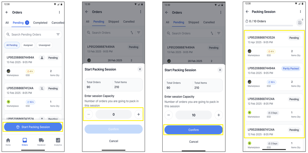 - When you click on Pending orders, you will notice a blue button labeled Start Packing Session. Click on this button and enter the number of orders you can fulfill in that session. Once you fill in the number, click on Confirm. The unassigned orders with the least/ nearest estimated shipping date are automatically assigned to you.