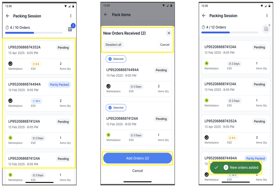 - While processing the order, if you get a new order assigned to you, you will notice a pop-up showing the number of orders assigned. You can select the order you want to process and click on Add orders. The order you don't select, since they are unassigned, remains unassigned. A confirmation pops up showing the assigned order is processed.