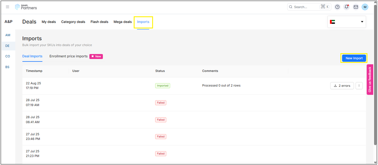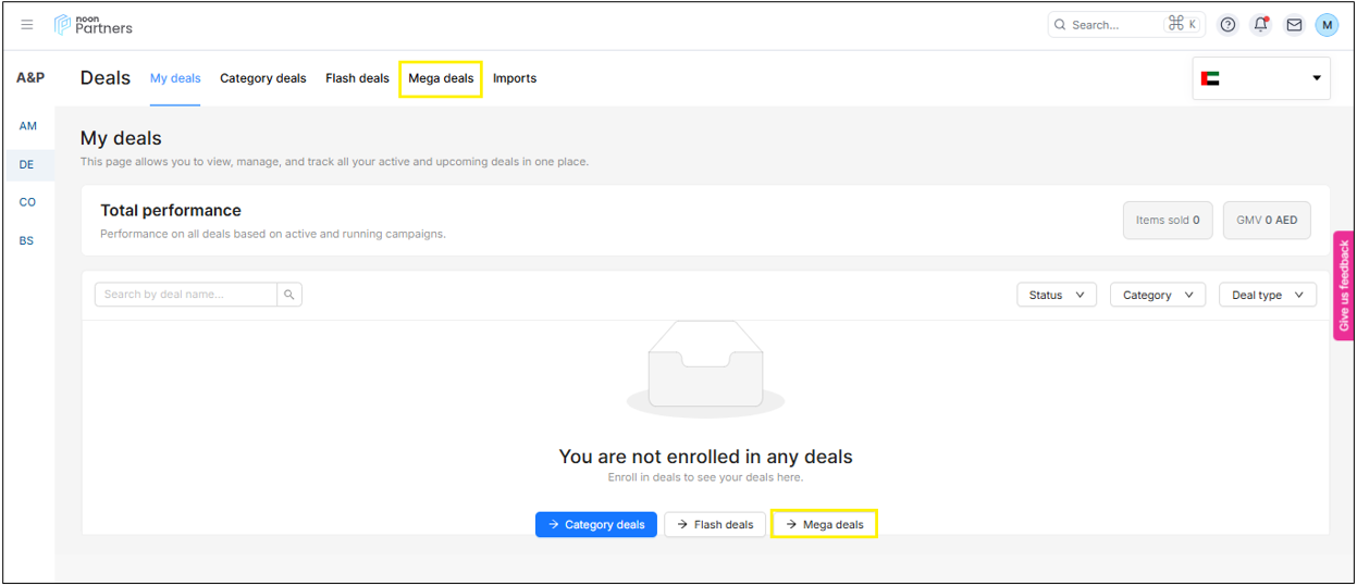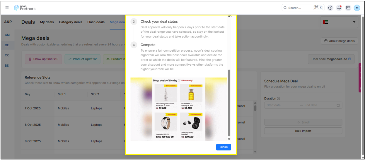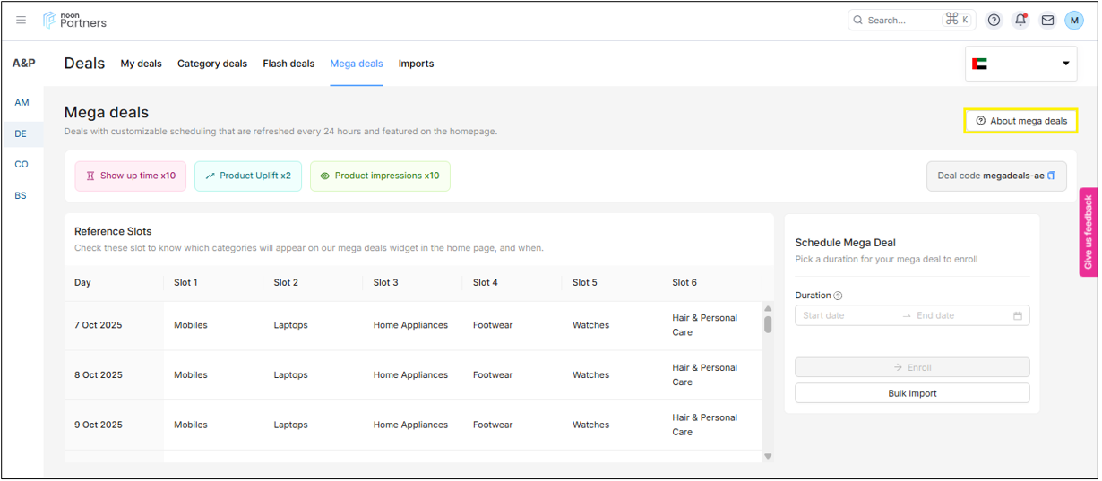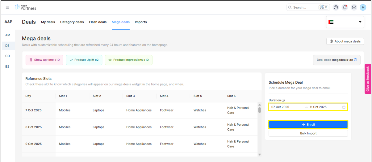 - Using the calendar, you can prioritize categories for Mega Deals on noon's webpage. Create a schedule to increase the chances of your SKU appearing in the Mega Deals box for its category. After selecting a date range, click on the Enroll button.