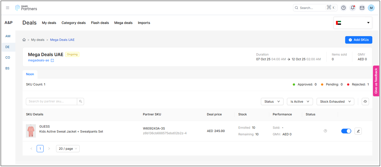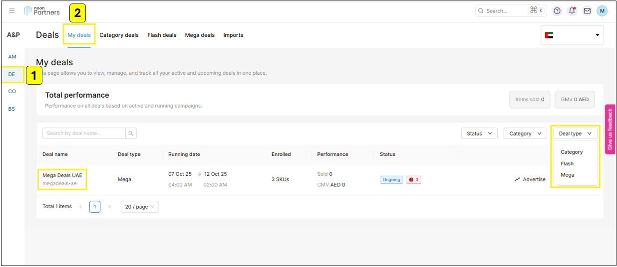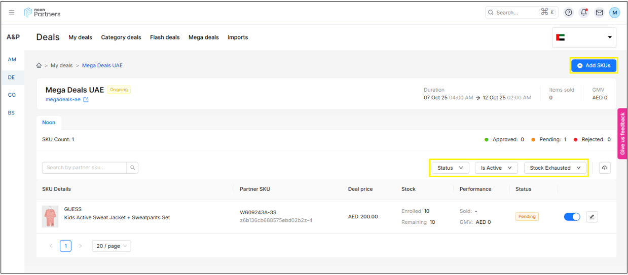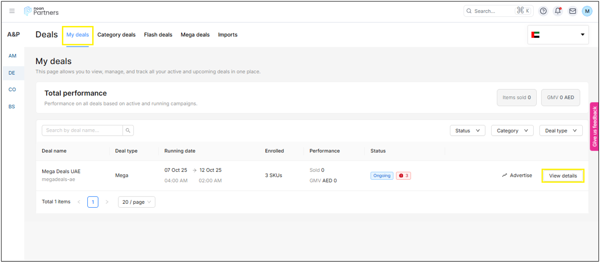 - To view the status of SKUs participating in Mega Deals, navigate to the Deals page and click on the My Deals tab. Under this section, you can either filter the mega deals using the filter option or see the deals with the name Mega Deals to view the details.