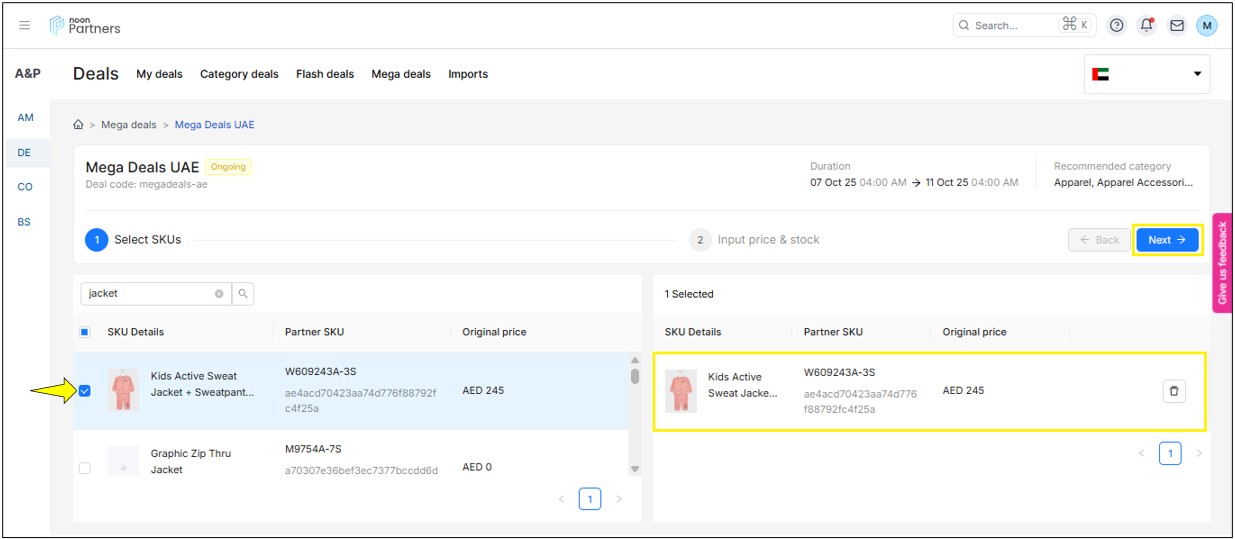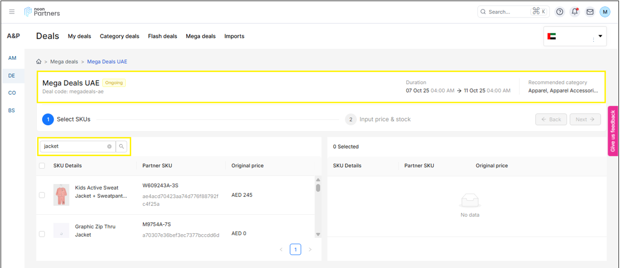 - You can see the details of the deals which include the duration and the recommended category. Choose the SKUs you want to include by searching for the SKU by the search option.