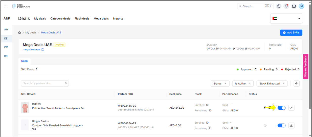 - To activate or deactivate an individual SKU, simply click on the toggle button next to the Partner SKU.