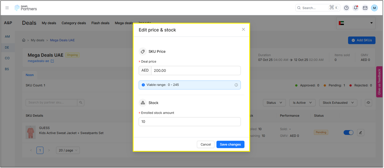 - To edit the deal stock and price for an SKU in Mega Deals, navigate to the My Deals tab in the deals section and click on View Details for the specific deal.