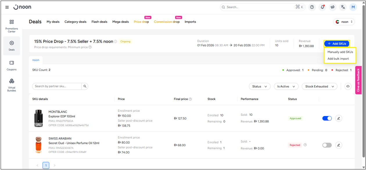 You can use the Add SKUs option to add more products to a deal even after it has started, allowing you to offer more amazing discounts.