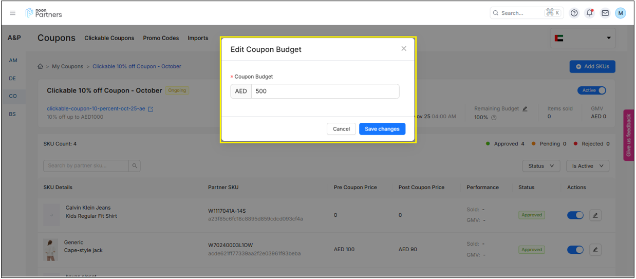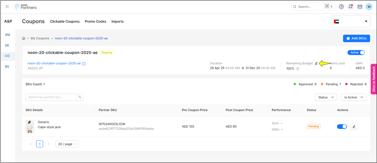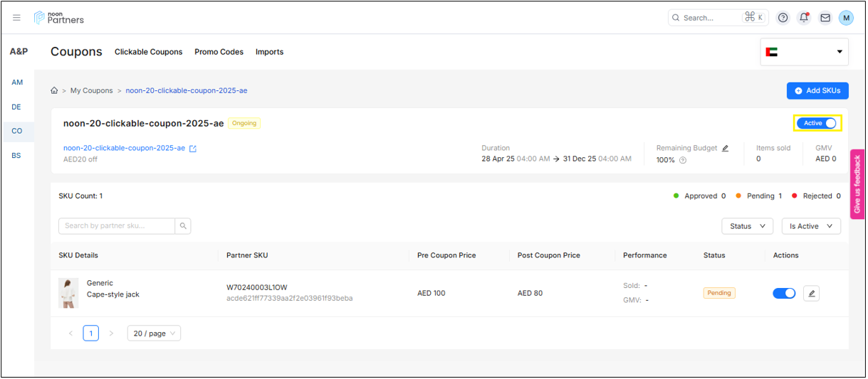 - The entire Coupon Assortment or a specific SKU can be taken on and off by clicking on the Active toggle either on top the campaign header or next to the SKU.