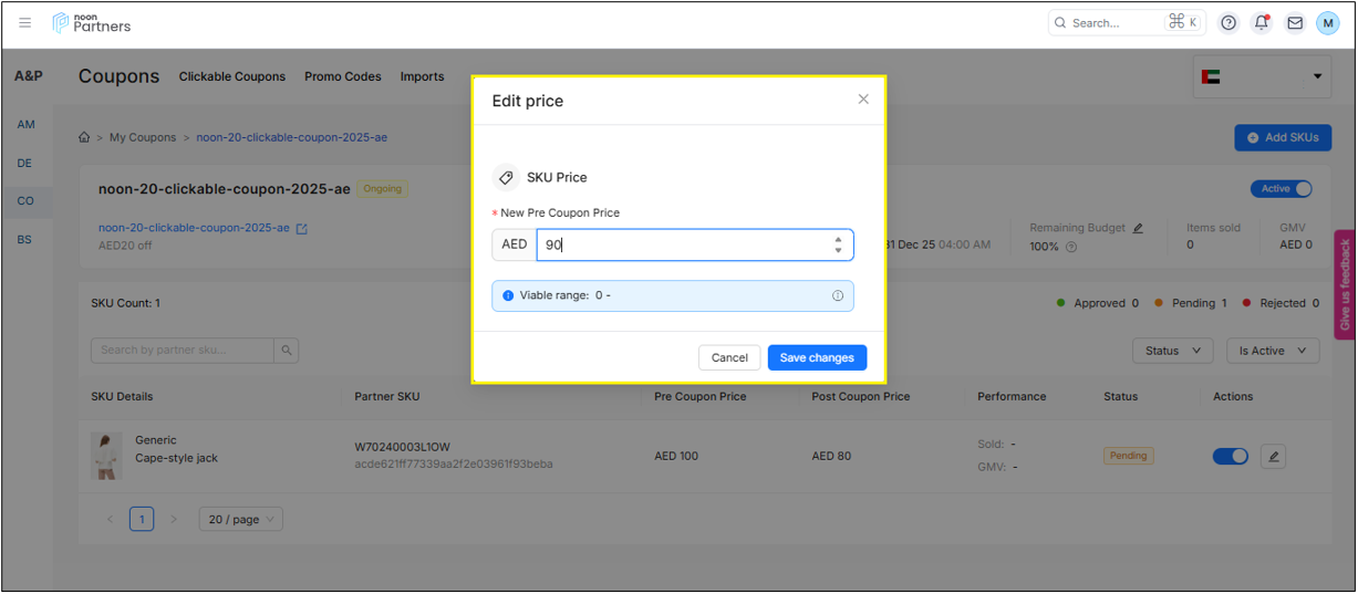 - You can click on Edit button right next to the SKU to make adjustments to the SKUs pre-coupon price. Once the price is adjusted, click on Save Changes to make the updates.