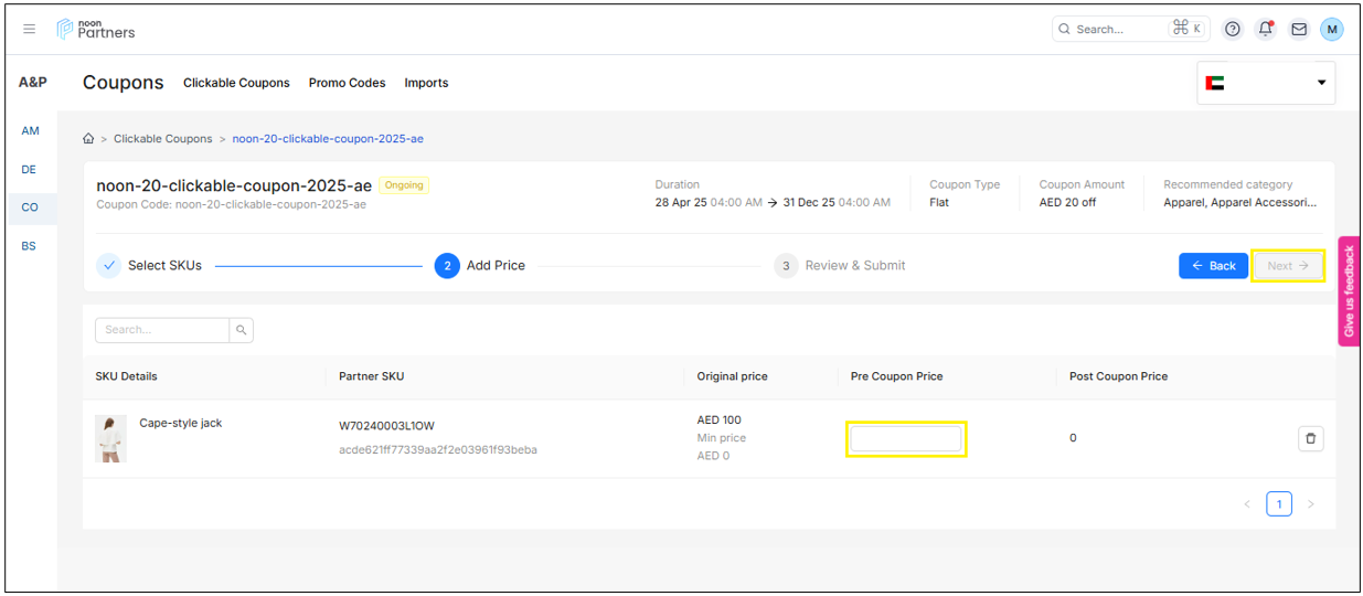 - In the next step you need to provide the pre-coupon price of the item. Please ensure the price is equal to or less than the current offer price to be accepted. Once you have updated the price click on Next.