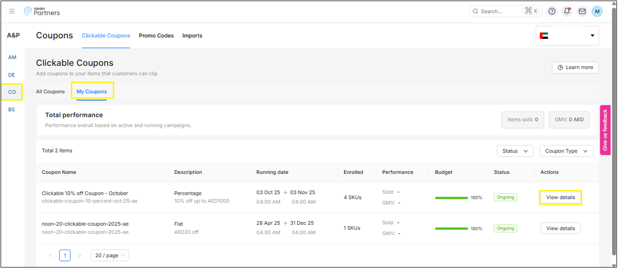 - Click on Coupons page, then go to My Coupons or My Promo Codes depending on the campaign you want to work on, and then click on View Details.