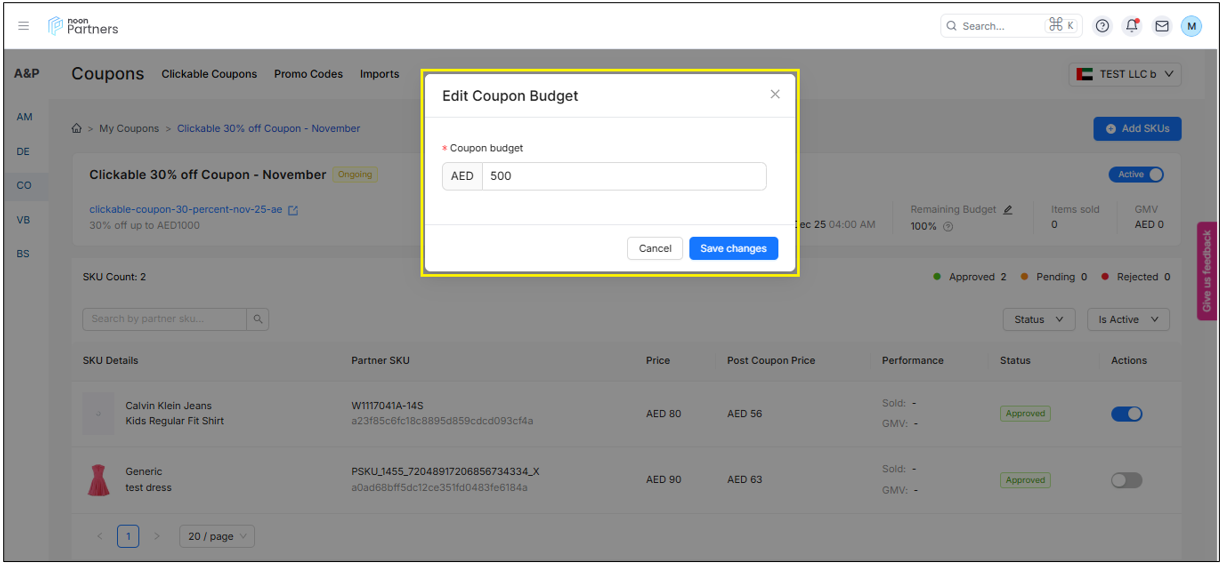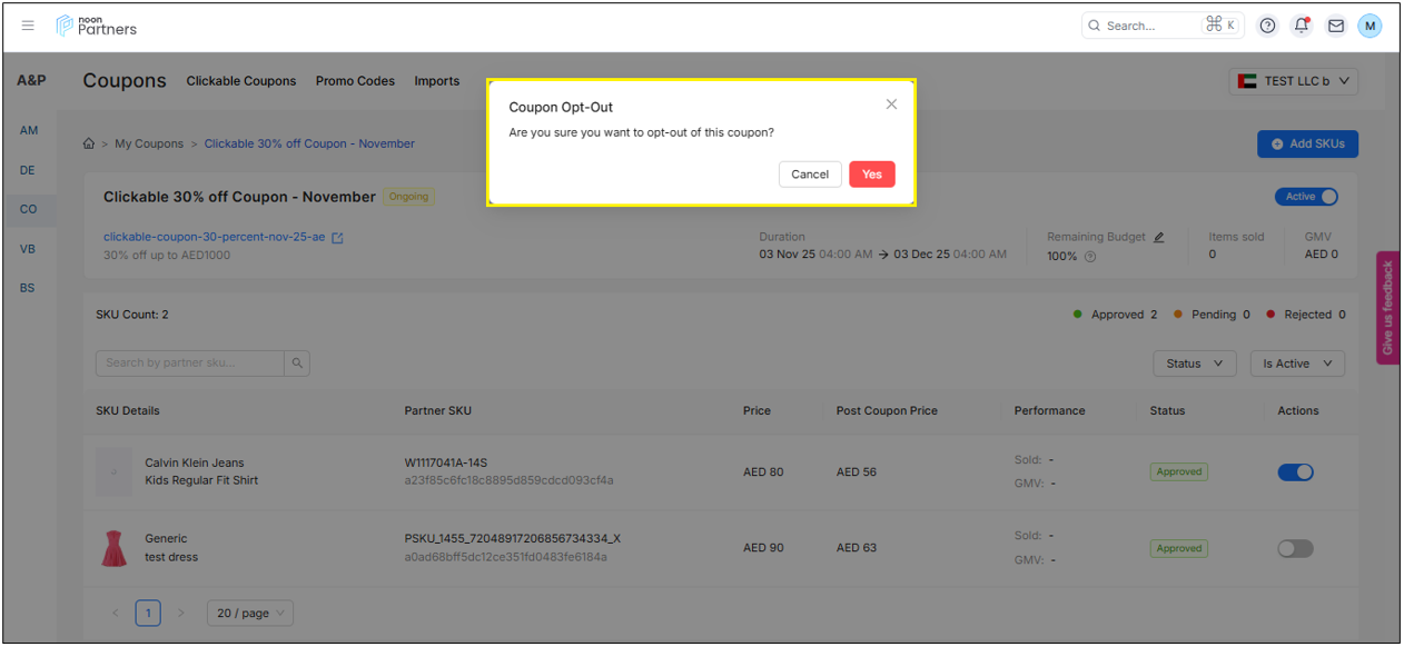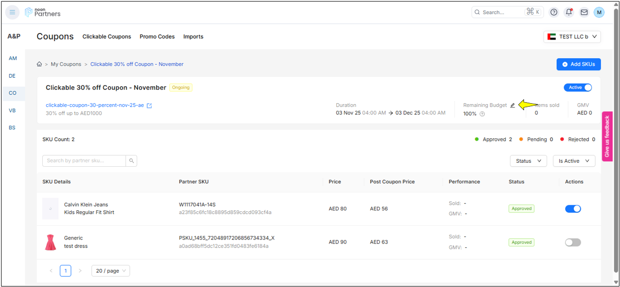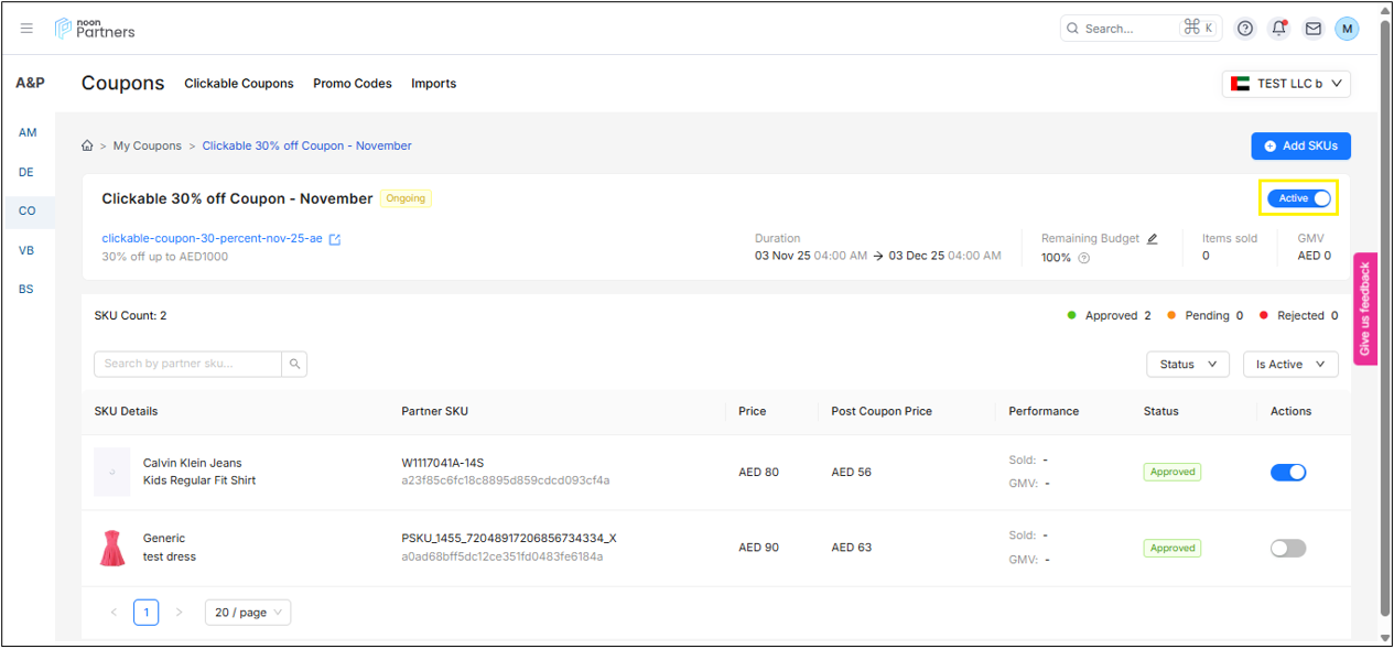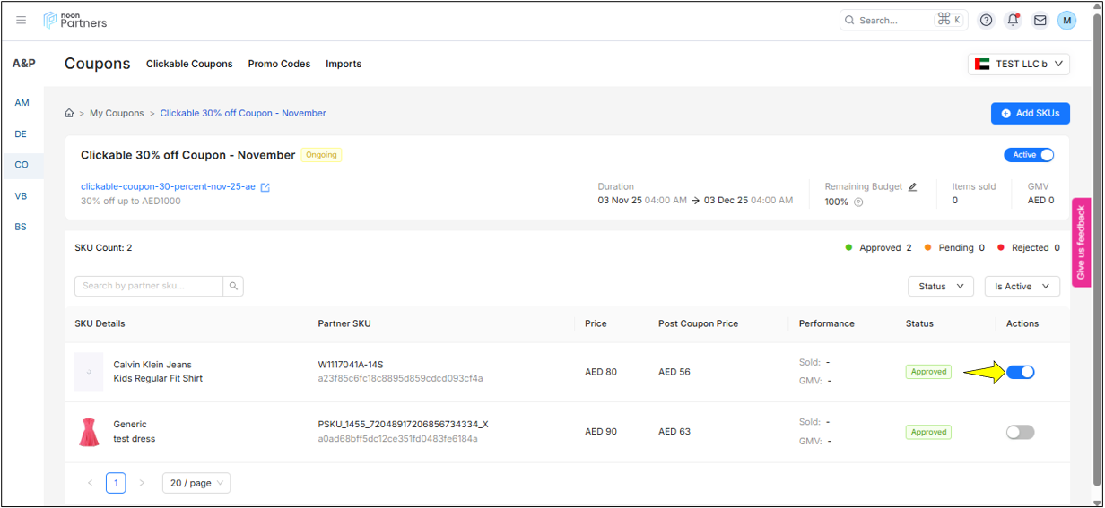 - The entire Coupon Assortment or a specific SKU can be taken on and off by clicking on the Active toggle either on top of the campaign header or next to the SKU.
