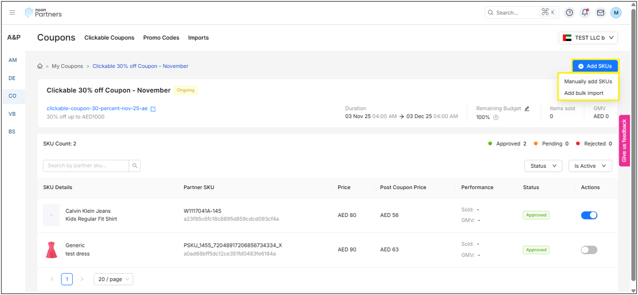 - You get an option to add more SKUs to the campaign by using the Add SKUs option. You will get an option to add the SKU either manually or using the bulk import option.
