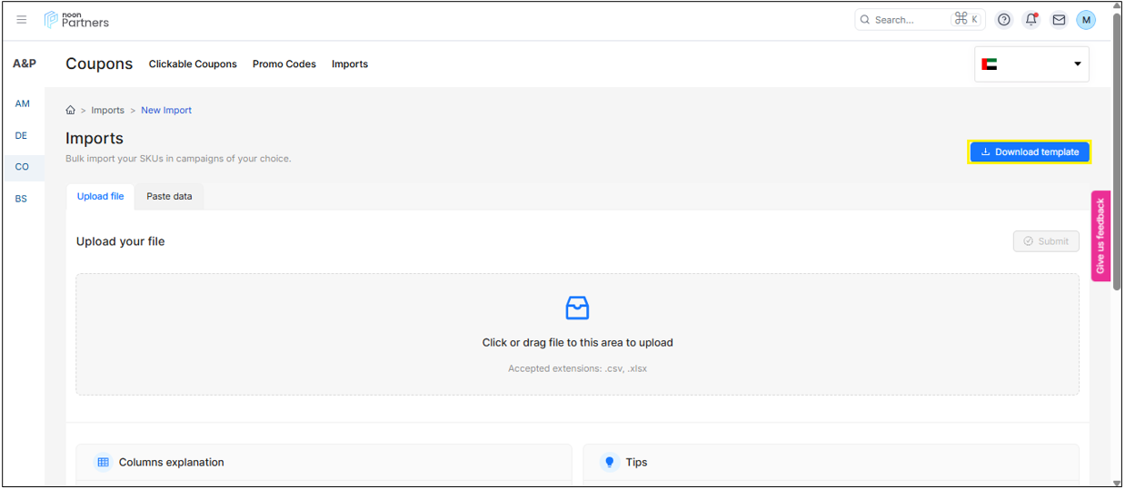- You will be redirected to the next page, where you have a button Download Template. Click on it to download the template for the bulk upload.
