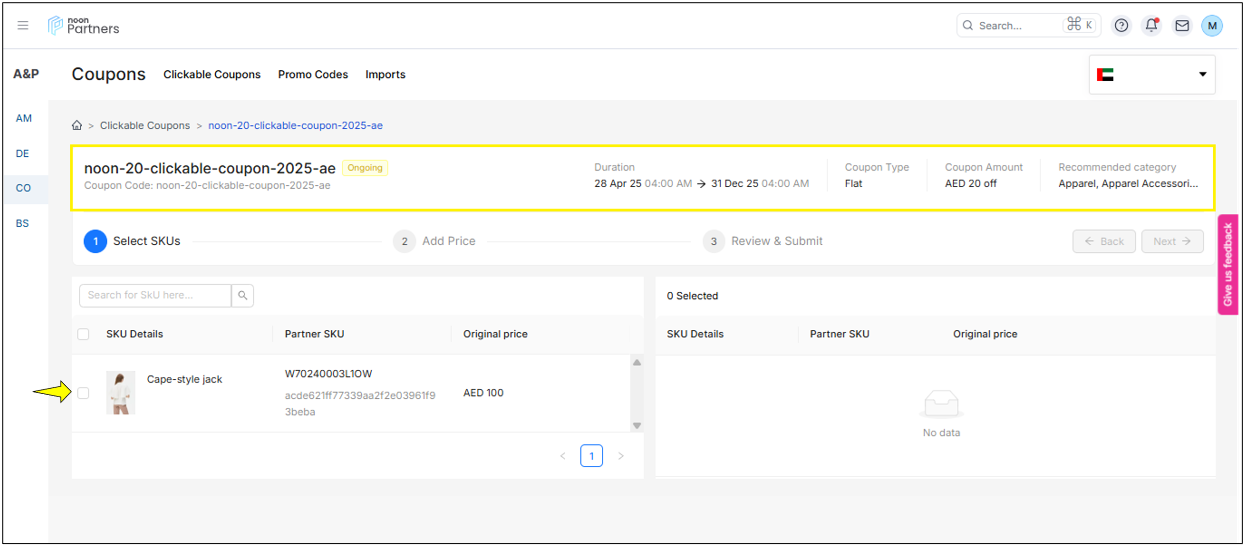 - You will be redirected to the campaign enrollment page, where you will see the details of the campaign. This will include the duration details, coupon type, coupon amount and the recommended category. Select the items you want to enroll in from the left side.