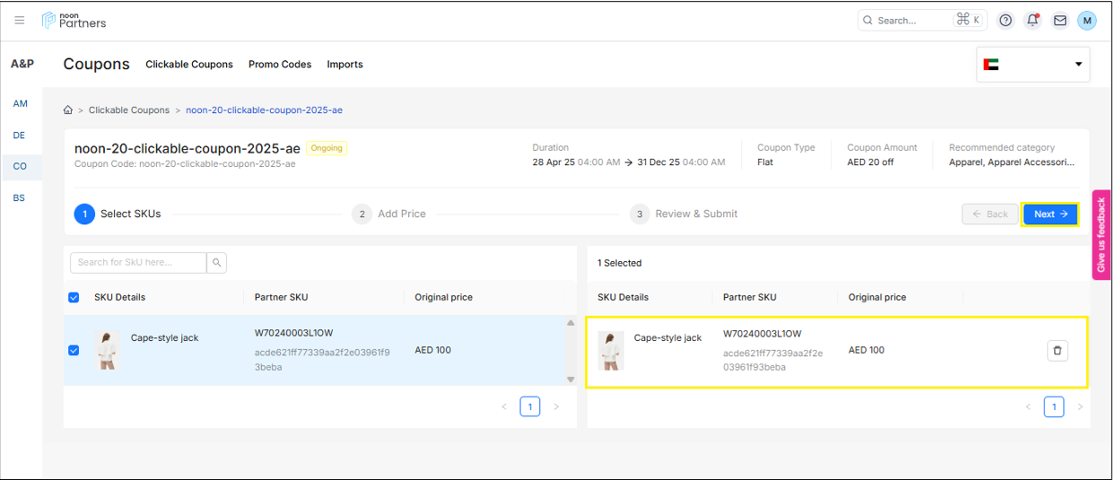 - The SKUs will move to the right side of the screen, and you will have an option to click on Next.