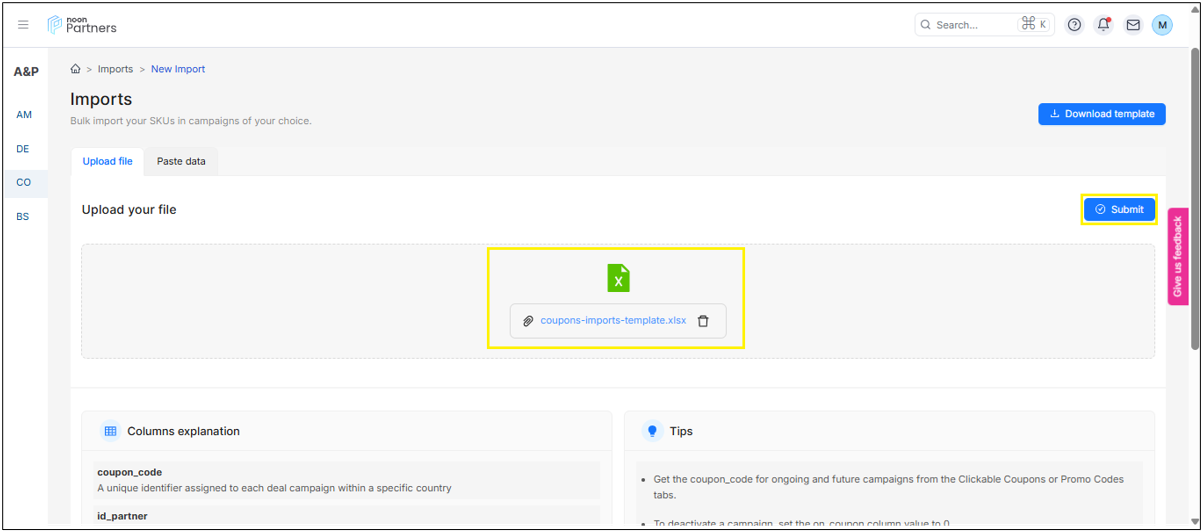 - Upload the sheet back to the importer, and click Submit. Your products will then be reviewed by the quality team to ensure that all information is correct, and they will go live within just a few days.