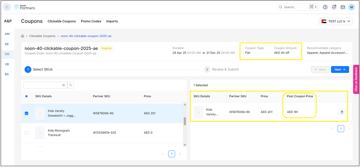 - The SKUs will move to the right side of the screen, and the system calculates the post-coupon price on the current offer price of the SKU you selected. This is calculated based on the coupon type and amount. You will have an option to click on Next.