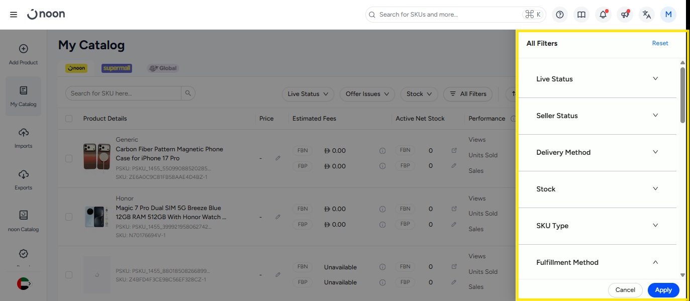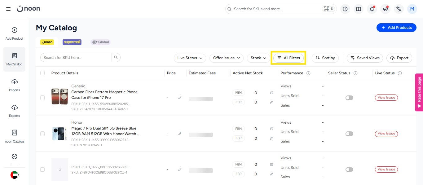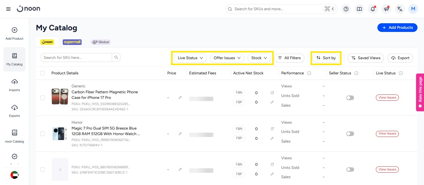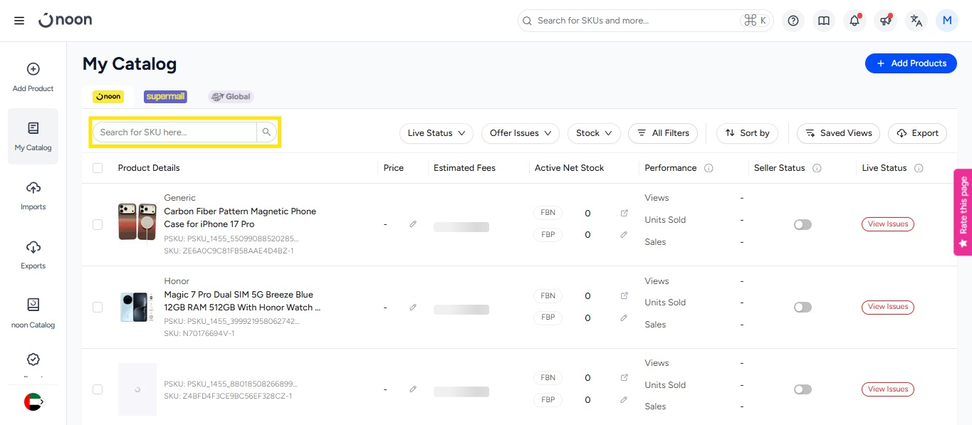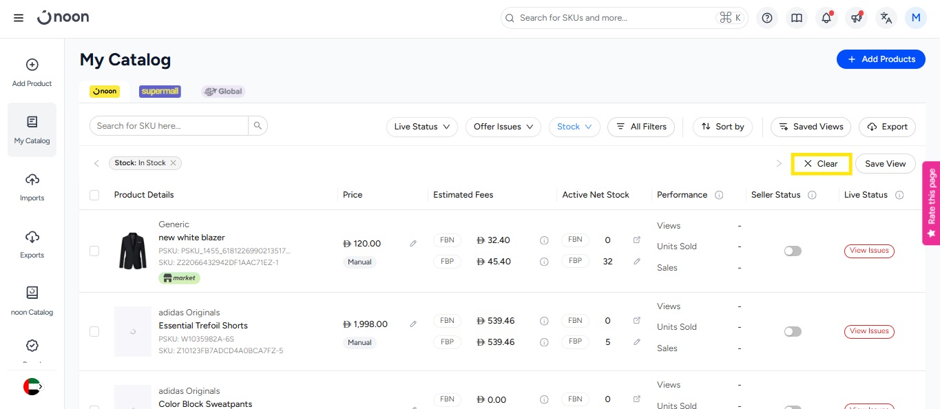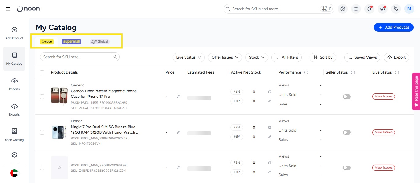 - noon: This view shows the SKUs that are sold under the FBP selling model ( marketplace ) and the SKUs for which you have transferred the stock to noon warehouse.