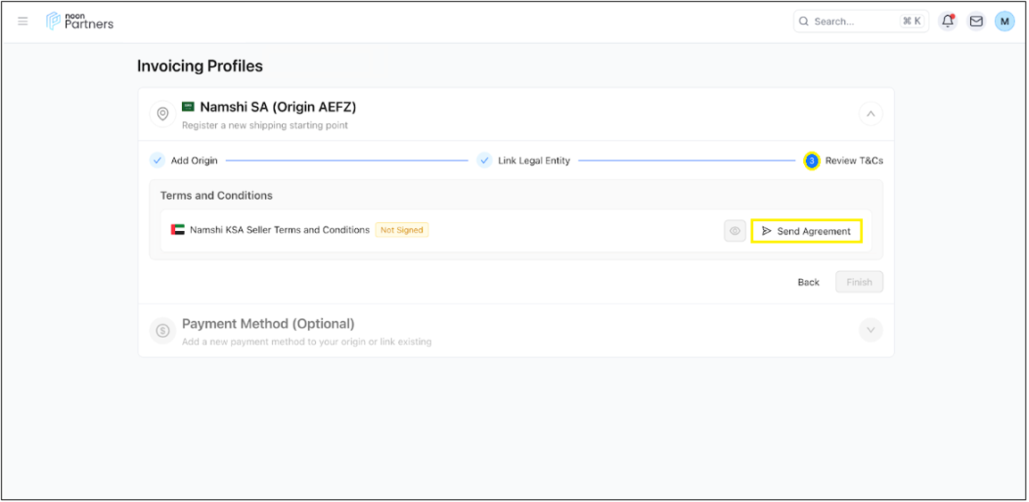 - In the Noon Store Details page, click on the Legal & Payments option.