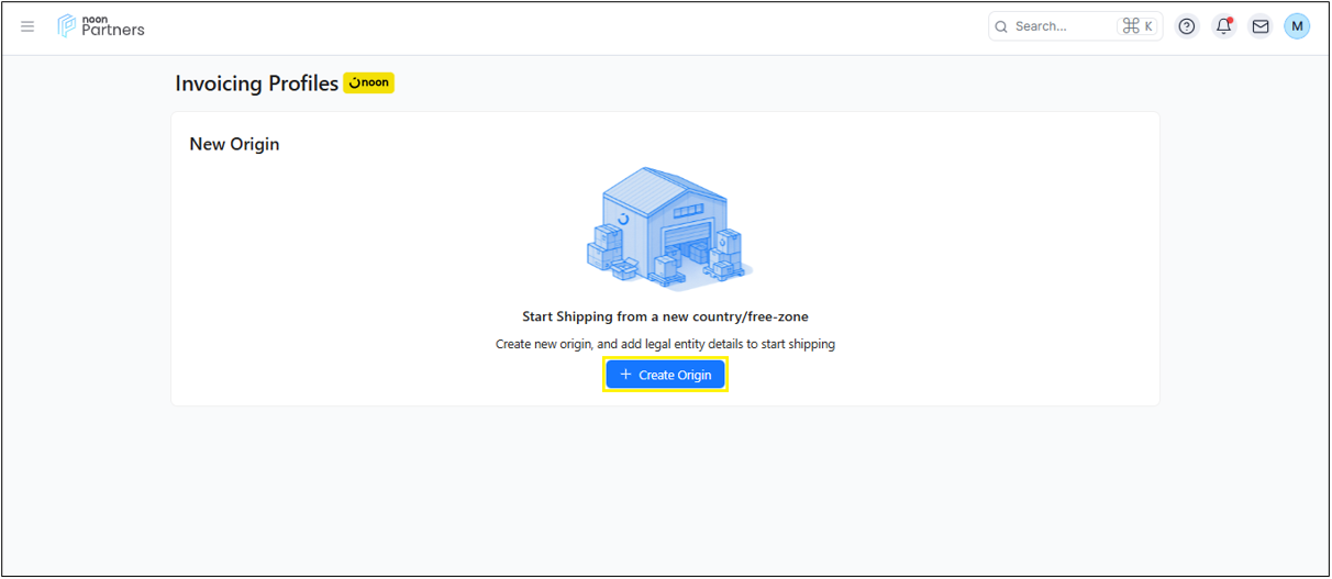 - You will be redirected to the Invoicing Profile. To start the creation of an invoicing profile, click on Create Origin.