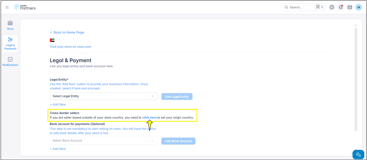 - On the next page, under the Legal & Payment section, you will see a notification for cross-border sellers. Click on the hyperlink to proceed.