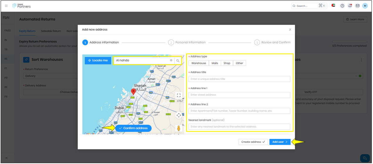 - In the next step, select the pin location on the map and click on Confirm Address. Fill in all the requested details of the address. Then click on Add User button.