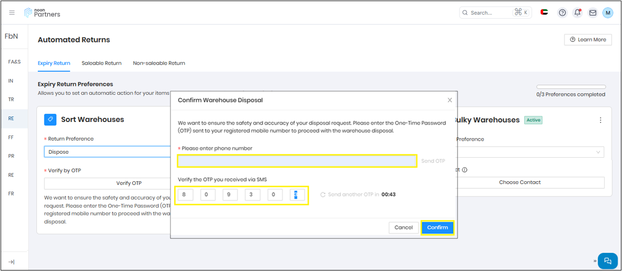 - Enter your mobile number and click on Send OTP. Enter the OTP and click Confirm to finalize the preference. The setup for the Dispose option remains the same for all the warehouse types.