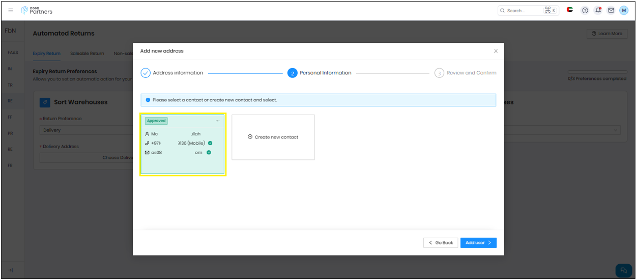 - Select your Return Preference as either Pickup or Dispose. Click on Choose Contact. Select a verified contact from the list provided. This will confirm your preference.