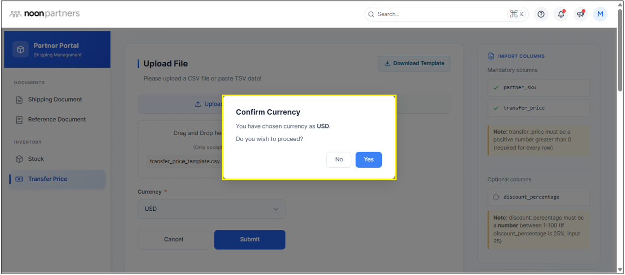 You will see a pop-up confirming the currency you have selected. You can click on Yes to submit the file.