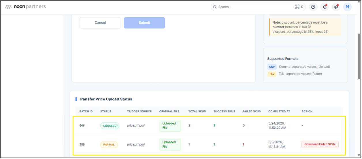 The Transfer Price is the base price at which the seller sells the products on noon. This value is used to calculate the final listing price on the platform and will be reflected in your daily Purchase Orders (POs).