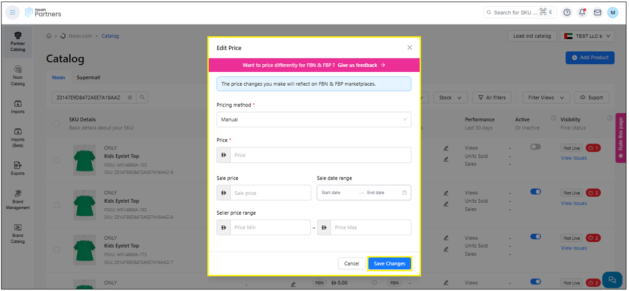 - In the pop-up that appears, you can update the pricing method, price of the SKU, sale price, and the sale start and end date. Once the details are updated, click on Save changes to reflect the changes.