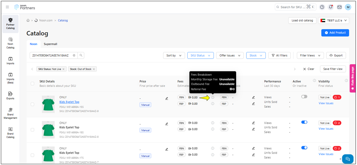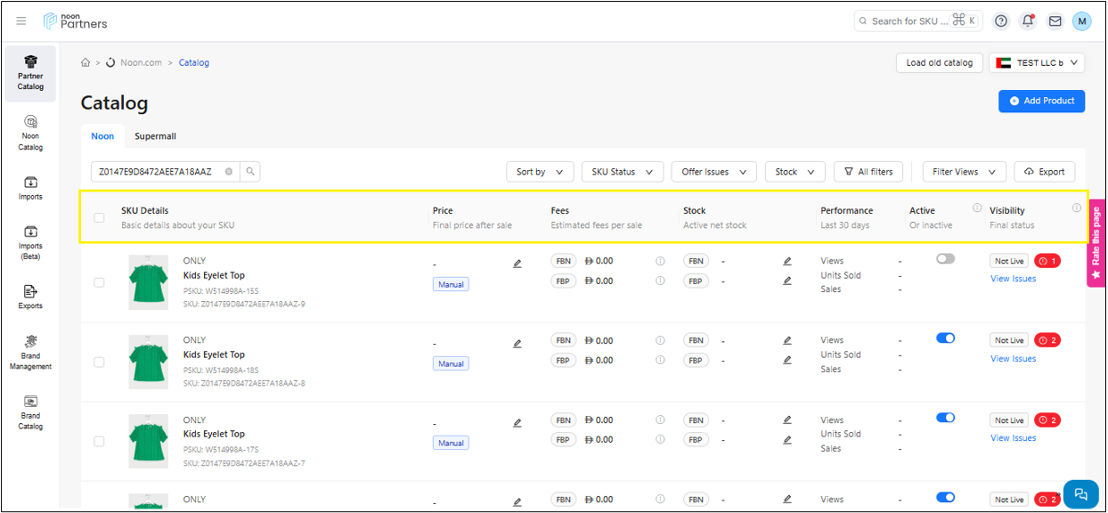 - Visibility: This shows if the SKU is live or not live on the platform and the issues why the SKU is not live.
