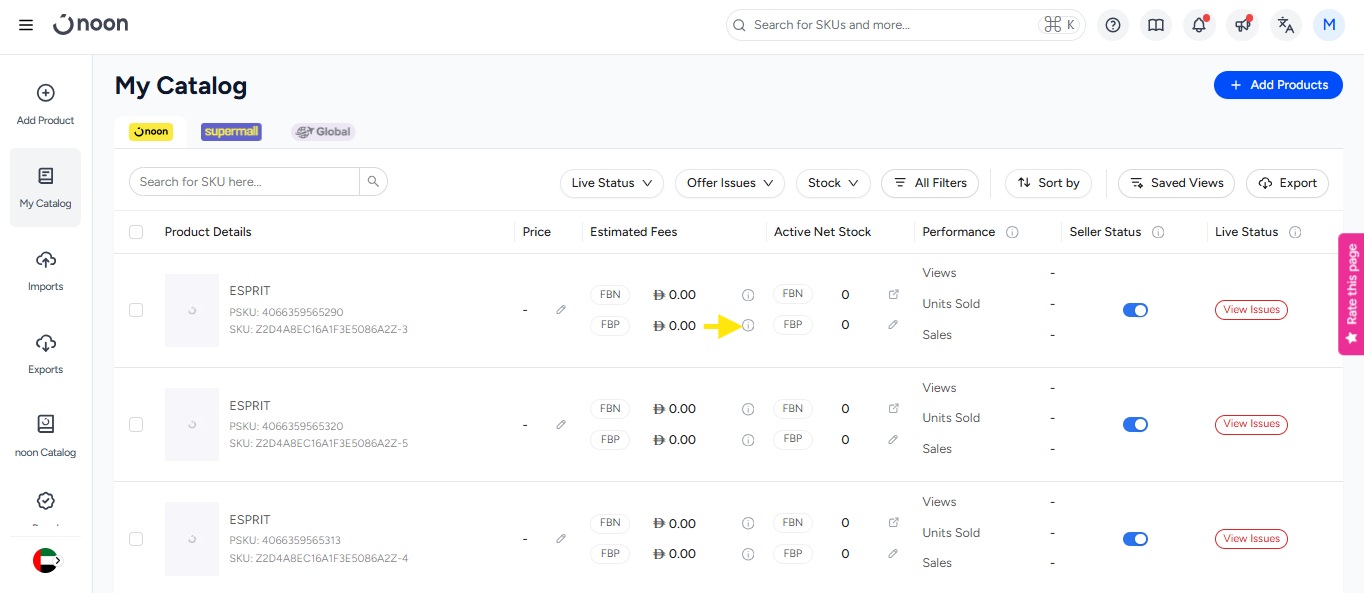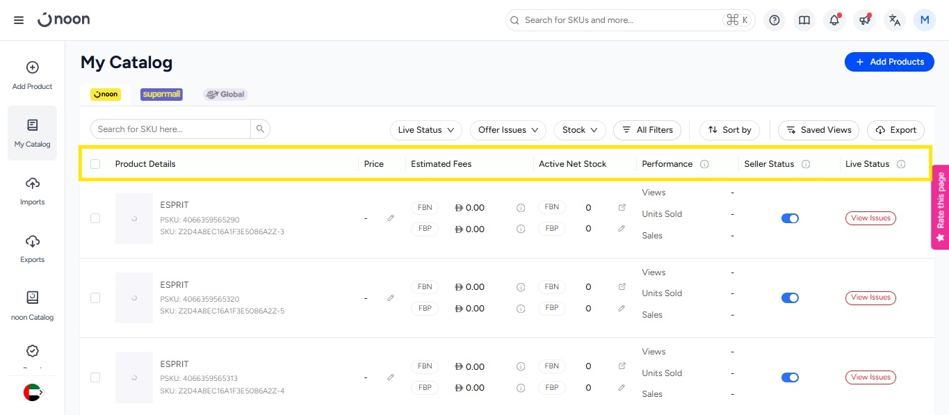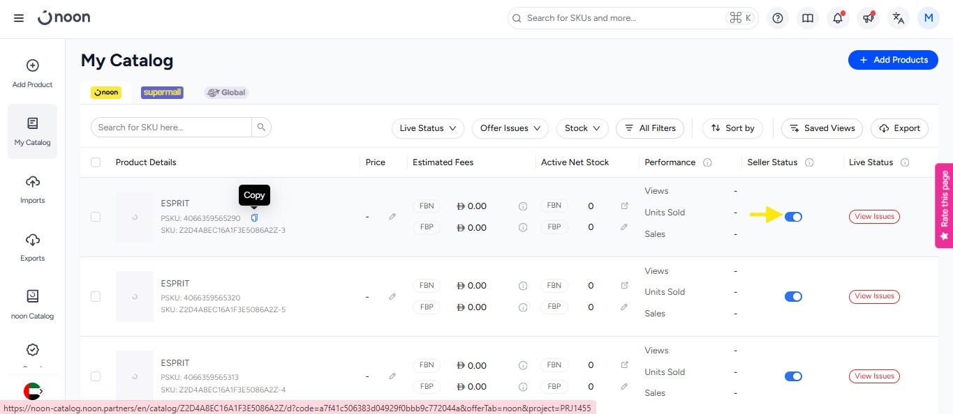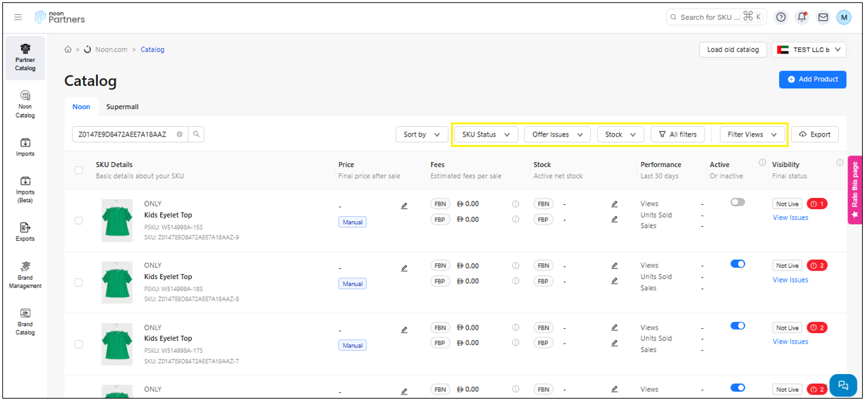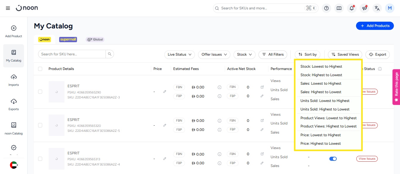 - You will notice a filter that refines the SKUs on this page based on the performance of the SKU. The performance includes the sales, product views, and the units sold.