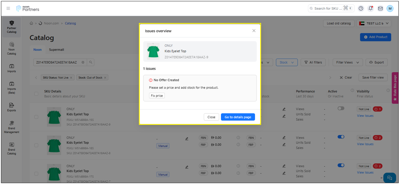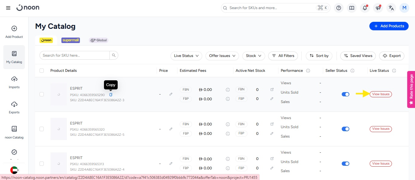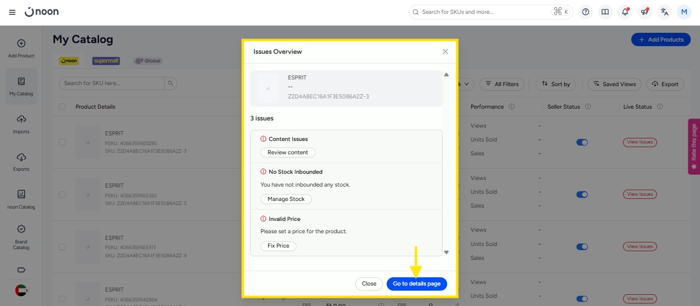 - You can also click on View Issues to check the reason why the SKU is not live. A pop-up will appear on the screen when you can check the reason and fix the issue to take the product live.