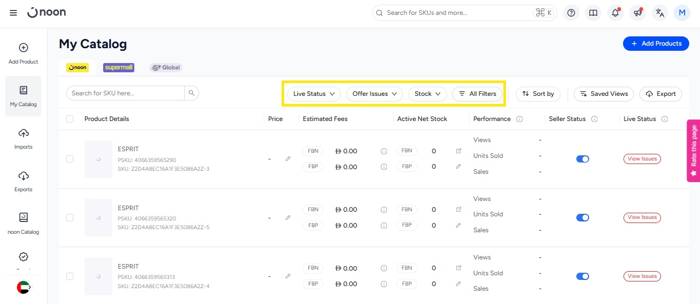 - You will also see some additional filters, such as the SKU status, whether it is live or not live, offer issue, which shows the SKUs that are not live due to some offer concern, stock status, whether the SKU is in stock or out of stock, and additional filters under All Filters. You can also save applied filters to create a Filter view and save it for future use.