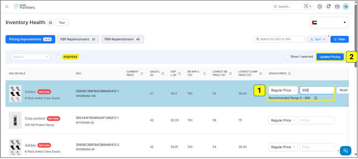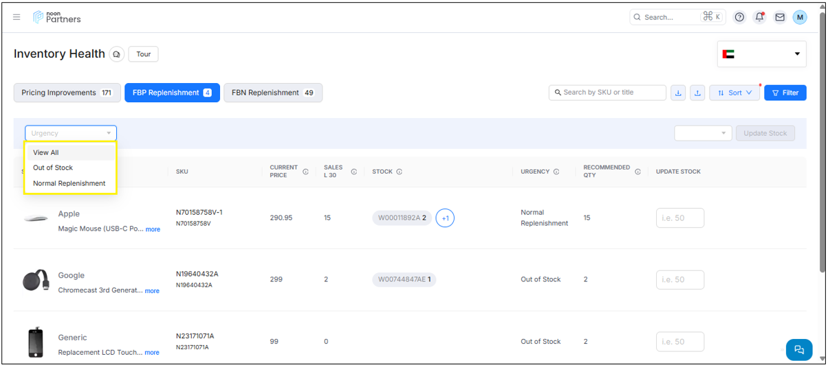 selling through Fulfilled by Noon (FBN) or Fulfilled by Partner (FBP) models, the dashboard delivers real-time suggestions to optimize your inventory