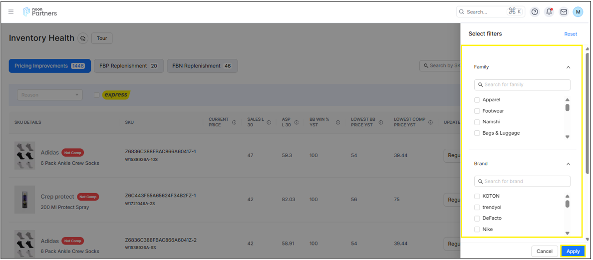pop-up will appear with multiple filters, such as Family, Brand, Visibility, and Marketplace SKU Priority. Select