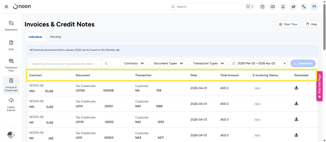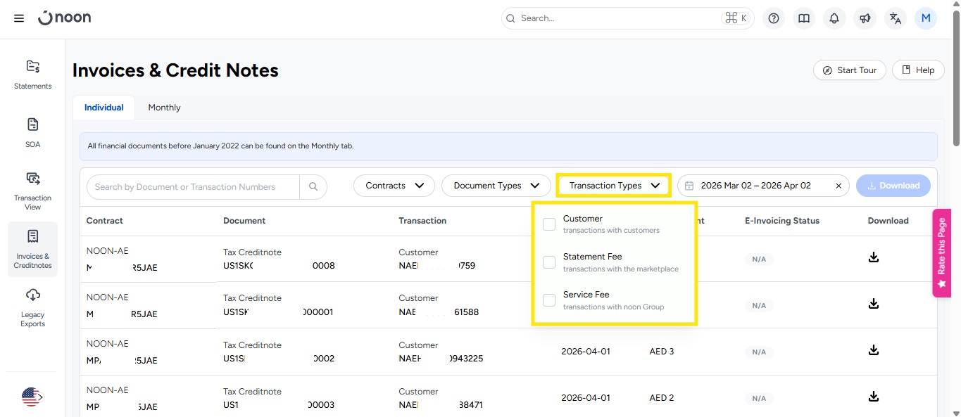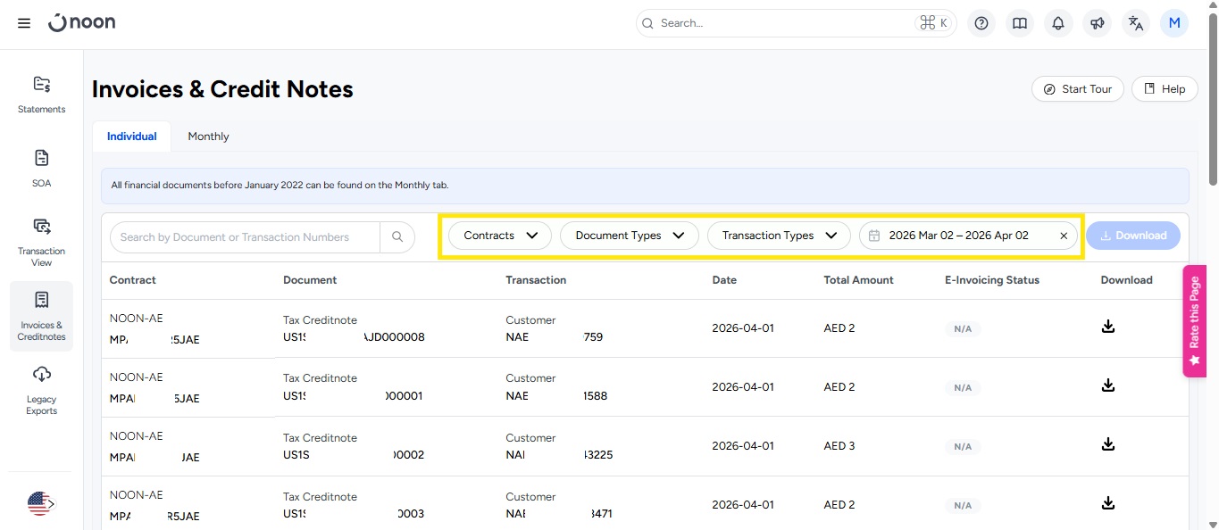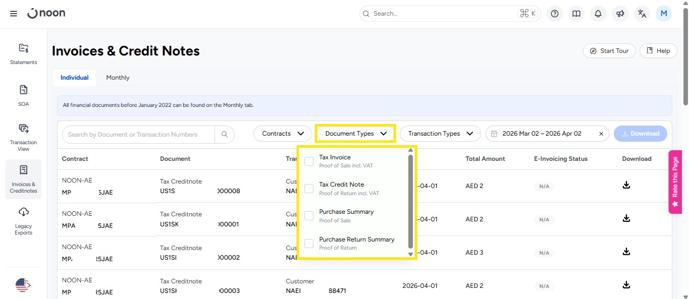 - Statement Fees Invoices/Creditnotes: noon issues tax invoices/credit notes on a weekly basis with each statement (only if the threshold of the total sales issued on the statement reaches the threshold of AED 1000 or more). These financial documents reflect the sum of the fees charged by noon on orders delivered to customers during a specific week. Use the statement fees invoices to claim your input VAT from the government.