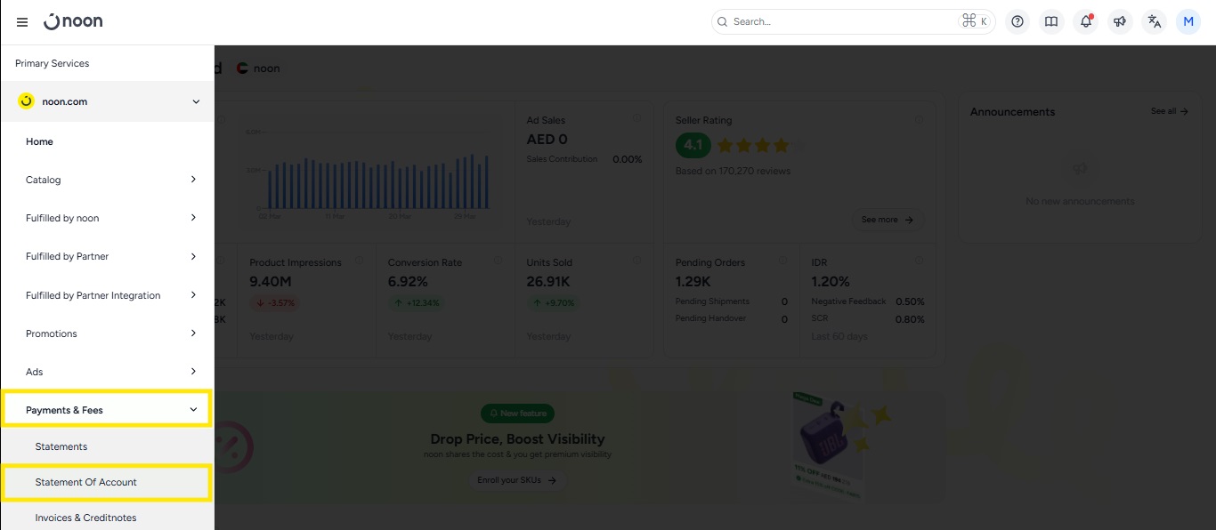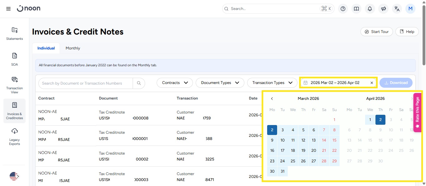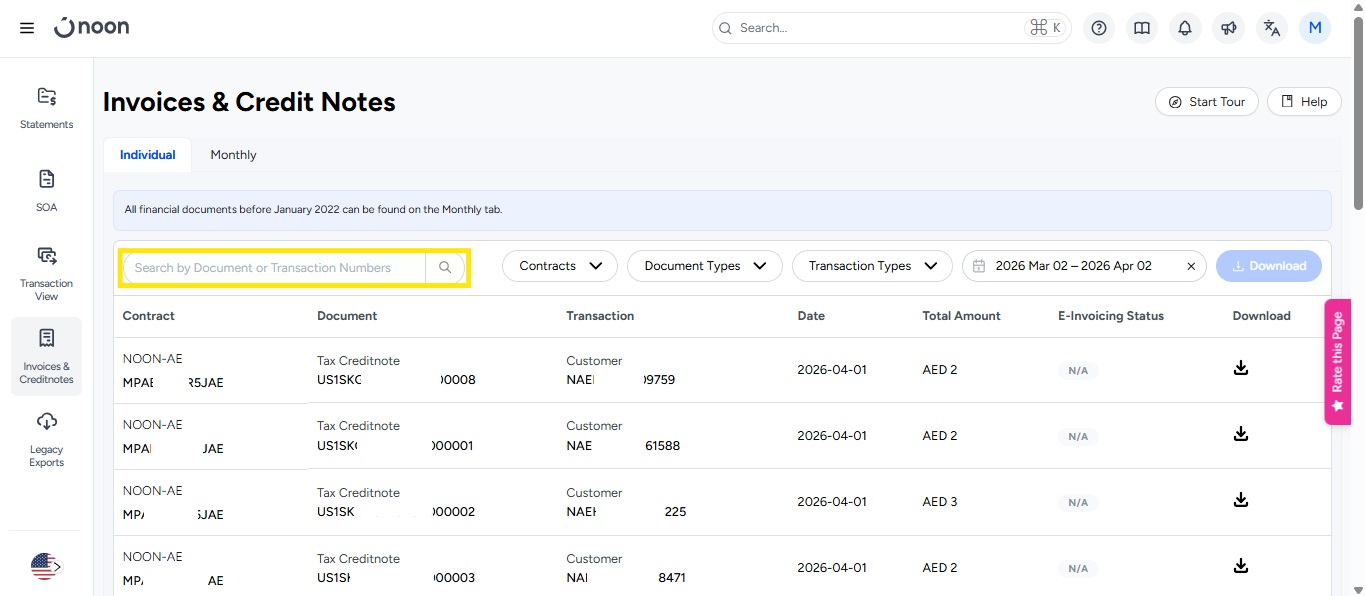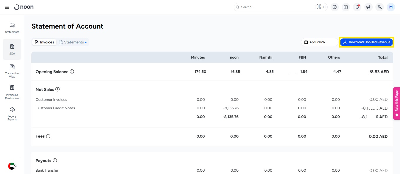 - Statement Fees Invoices/Creditnotes: noon issues tax invoices/credit notes on a weekly basis with each statement (only if the threshold of the total sales issued on the statement reaches the threshold of AED 1000 or more). These financial documents reflect the sum of the fees charged by noon on orders delivered to customers during a specific week. Use the statement fees invoices to claim your input VAT from the government.